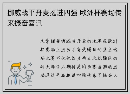 文章摘要:挪威与丹麦的比赛在欧洲杯赛场上成为了备受瞩目的焦点。这场比赛不仅仅因为两支北欧强队的对决而令人期待,更因为赛后挪威成功通过平局挺进四强,传来了振奋人心的喜讯。本文将从四个方面详细探讨这场精彩的赛事,分别从比赛过程、战术分析、球员表...