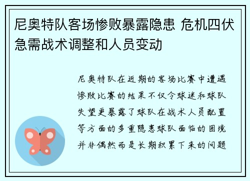 尼奥特队客场惨败暴露隐患 危机四伏急需战术调整和人员变动