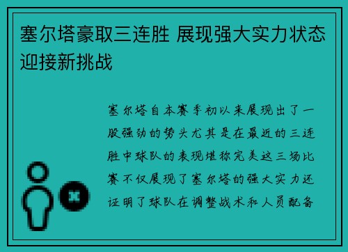 塞尔塔豪取三连胜 展现强大实力状态迎接新挑战