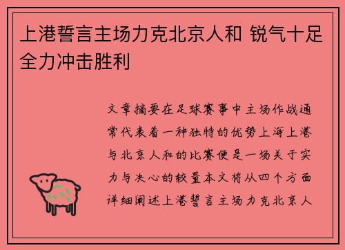 文章摘要:在足球赛事中,主场作战通常代表着一种独特的优势。上海上港与北京人和的比赛便是一场关于实力与决心的较量。本文将从四个方面详细阐述上港誓言主场力克北京人和,锐气十足,全力冲击胜利的精神面貌与赛事背后的故事。首先,本文分析了上港主场作战...