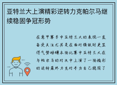 亚特兰大上演精彩逆转力克帕尔马继续稳固争冠形势